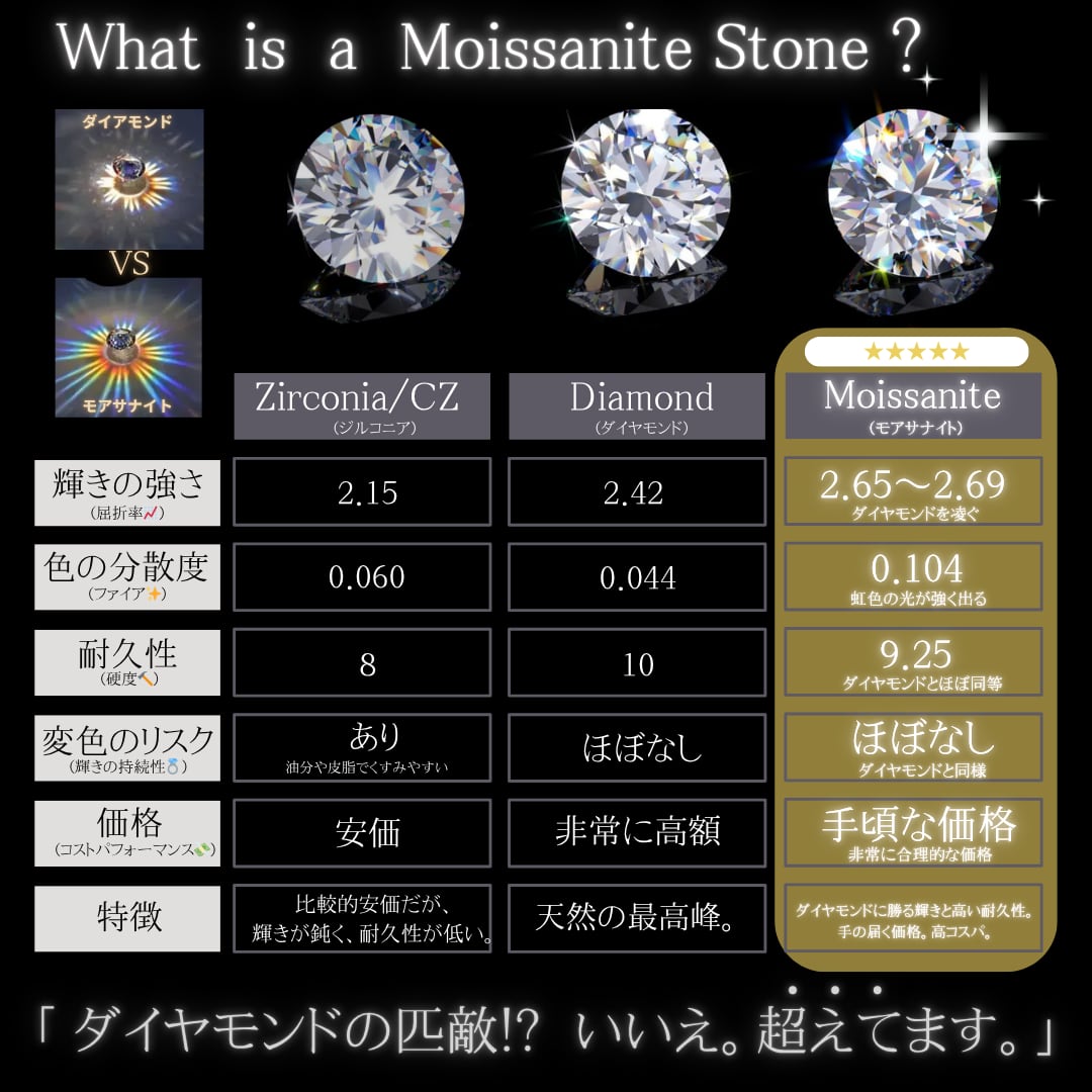 A.「ダイヤモンドの代わり」ではなく、【ダイヤモンドをも超える輝きを持つ宝石】として、現在世界的に人気を集めているのがこのモアサナイトです。ダイヤモンドを凌ぐとされる「虹色の強い輝き(ファイア)」と「高い耐久性(硬さ)」。透明度・輝き・硬さのすべてにおいて最高水準でありながら、手の届きやすい合理的な価格と環境に優しいエシカルな選択肢として、今、全世界で注目されている次世代の宝石です。